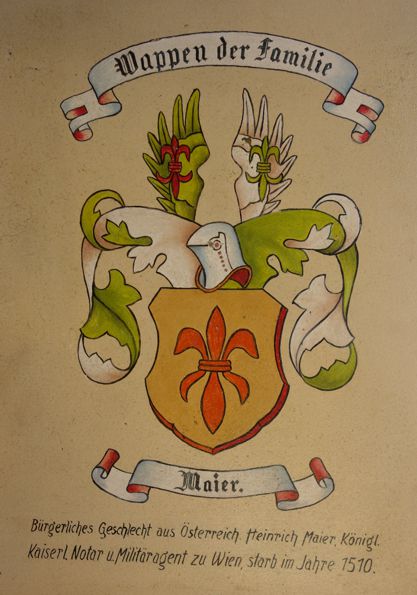 Vor 4 Jahren erhielt ich über eine Tochter der Ida Fetzer, Tochter der Anna Maier, (Rössleswirtin) das hier abgebildete auf Hartfaserplatte gemalte Wappen einer Familie Maier, das, der Inschrift zufolge, einem bürgerlichen Geschlecht aus Österreich zuzuordnen ist, wobei dasselbe auf einen Kaiserlichen Notar und Militäragent und mittelalterlichen Vorfahr namens Heinrich Maier zu Wien, verstorben im Jahr 1510 zu Wien, geschrieben steht. Als Zusatzinformation erhielt ich den Verweis darauf, dass dieses Wappen vor dem Abbruch der Gastwirtschaft „Rössle“ beim Ausräumen der Bühne zum Vorschein gekommen ist.