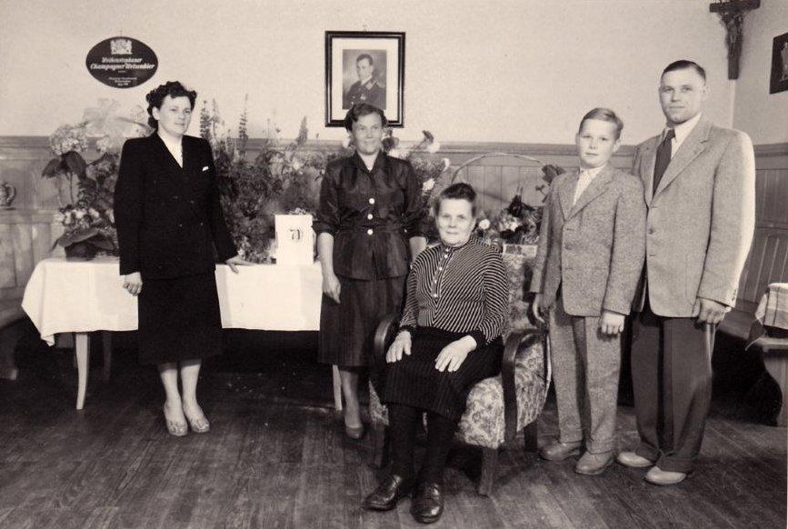 Unser Foto stammt aus dem Jahr 1956. Es wurde am 70. Geburtstag der „Rössleswirtin“ Anna Maier aufgenommen (siehe Bericht in BuG vom 29.6.1956). Das Foto zeigt von links: 1. Gertrud Liersch, 2. Frau Clementine Müller (von ihr ist überliefert: „Dui hot beim Fußball so laut gschriea, dass mr’s em ganza Dorf gwisst hat: des isch d’Clementine“. 3. Sitzend: Anna Maier, Rösslewirtin, 4. Enkel Klaus Maier. 5. Josef Maier, Sohn der Rössleswirtin. – An der Wand hängt ein Foto des am 10.5.1940 im 2. Weltkrieg gefallenen Sohns Max des Rössleswirts Max Maier (siehe Heimatbuch Seite 206).
