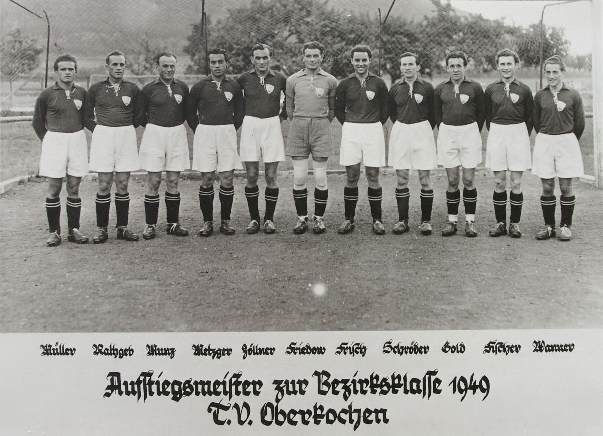 Und dann war da noch das Jahr 1949. Glanz- und Höhepunkt in der Vereinsgeschichte des TVO Abt. Fußball. Mit 4 Omnibussen fuhren sie nach Schwäbisch Gmünd. Dieser starke Anhang gab den Spielern ein supergutes Gefühl. Und doch lagen sie anfangs mit 0:2 im Rückstand. Erst in der zweiten Spielhälfte gelang ihnen der Ausgleich und kurz vor dem Abpfiff, durch einen klassischen Konter, sogar der Siegtreffer. Damit war die Truppe mit 5:3 Punkten Aufstiegsmeister und dominierte als Dorfmannschaft aus dem Wiesengrund des Kocherursprungs über die beiden städtischen Mannschaften. Die Sensation war perfekt. Ein begeisterter Empfang in Oberkochen. Unter den Klängen des Musikvereins geleitete man die Truppe in die »Grube« wo die gebührende Feier ihren Anfang und wer weiß wann und wie ihr Ende nahm.