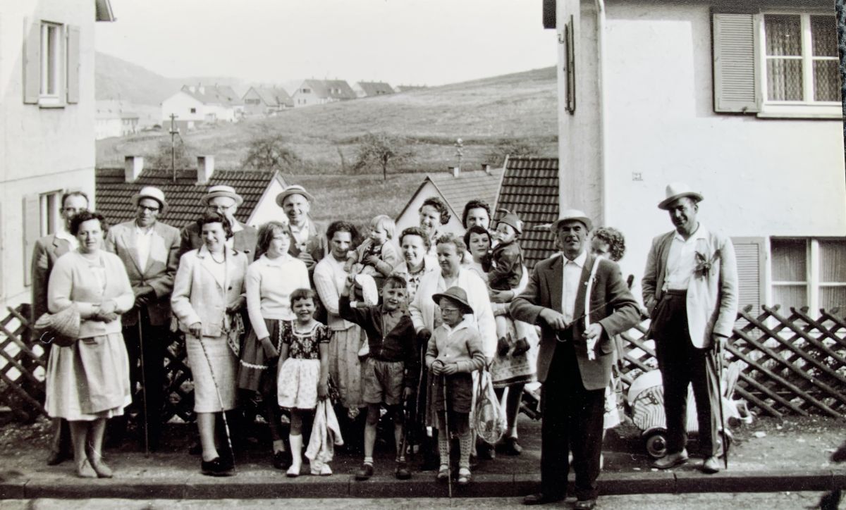 Der „Kegelclub Sonnenberg“ (Billie Mitte erste Reihe flankiert von Barbara Huber und Manfred Vater) vor der Maiwanderung vor dem früheren Lehrer-Haus im Sonnenberg 23 (Archiv Müller)